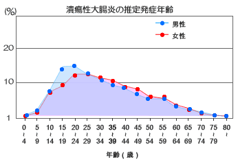 年齢別では、10代後半から20代前半に発病するケースが多く、男性と女性の比率は1:1となります。